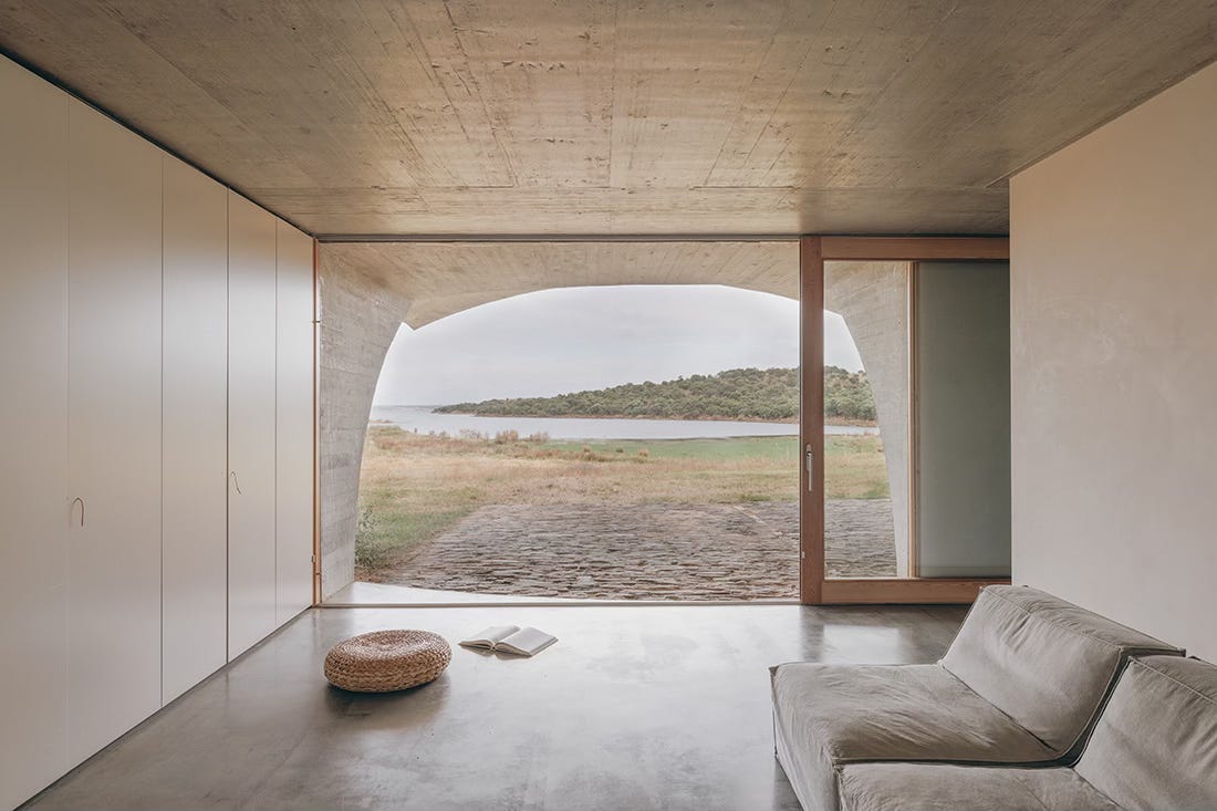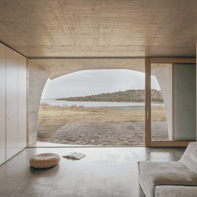 Awarded Arch Daily’s Building of the Year in 2020, it’s a structure that seems to melt into the earth while emerging from it at the same time. From a distance, you might only notice a few geometric hints: private patios cut into the hillside and a striking dome that gathers light and people in equal measure. Step inside and the conversation between architecture and landscape becomes clear: three ensuite rooms, each with its own patio; a kitchen and living area opening onto a grand terrace with sweeping views over Alqueva Lake; and at the center, that dome, carved from the slope itself, acting as the gravitational heart of the home.